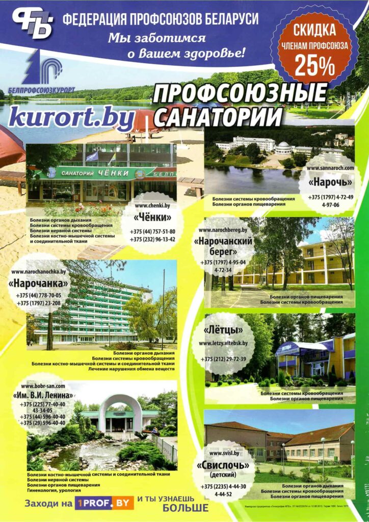 Ссылка на официальный сайт санаториев Федерации профсоюзов Беларуси — «Белпрофсоюзкурорт» https://kurort.by/