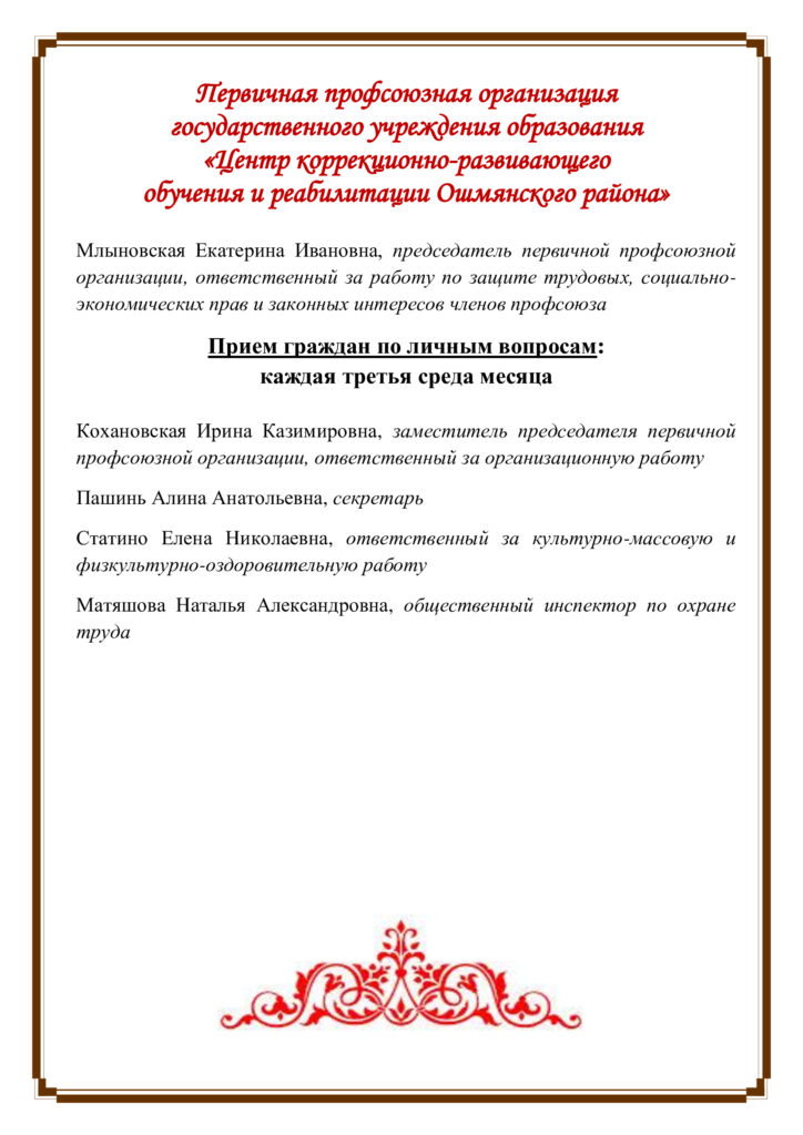 Участие в акциях и мероприятиях, проводимых управлением образования Ошмянского районного исполнительного комитета и райкомом профсоюза. | в течение полугодия | Млыновская Е.И. | |