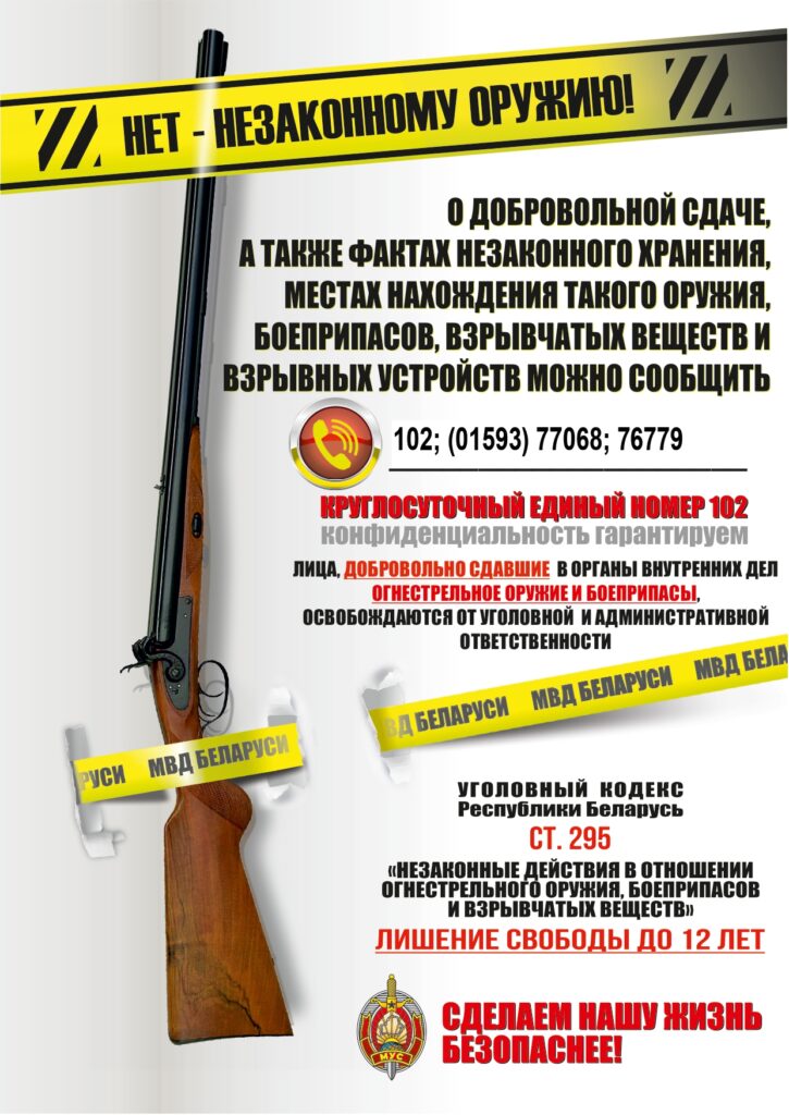 По вопросам сдачи незаконно хранящегося оружия, боеприпасов, взрывчатых веществ и взрывных устройств или о месте их нахождения, Вы можете обращаться в Ошмянский РОВД и по телефонам горячей линии: 77335 (факс), м.т. 8 (029) 35-31-442 или 102.