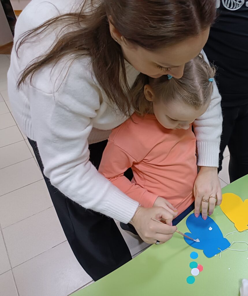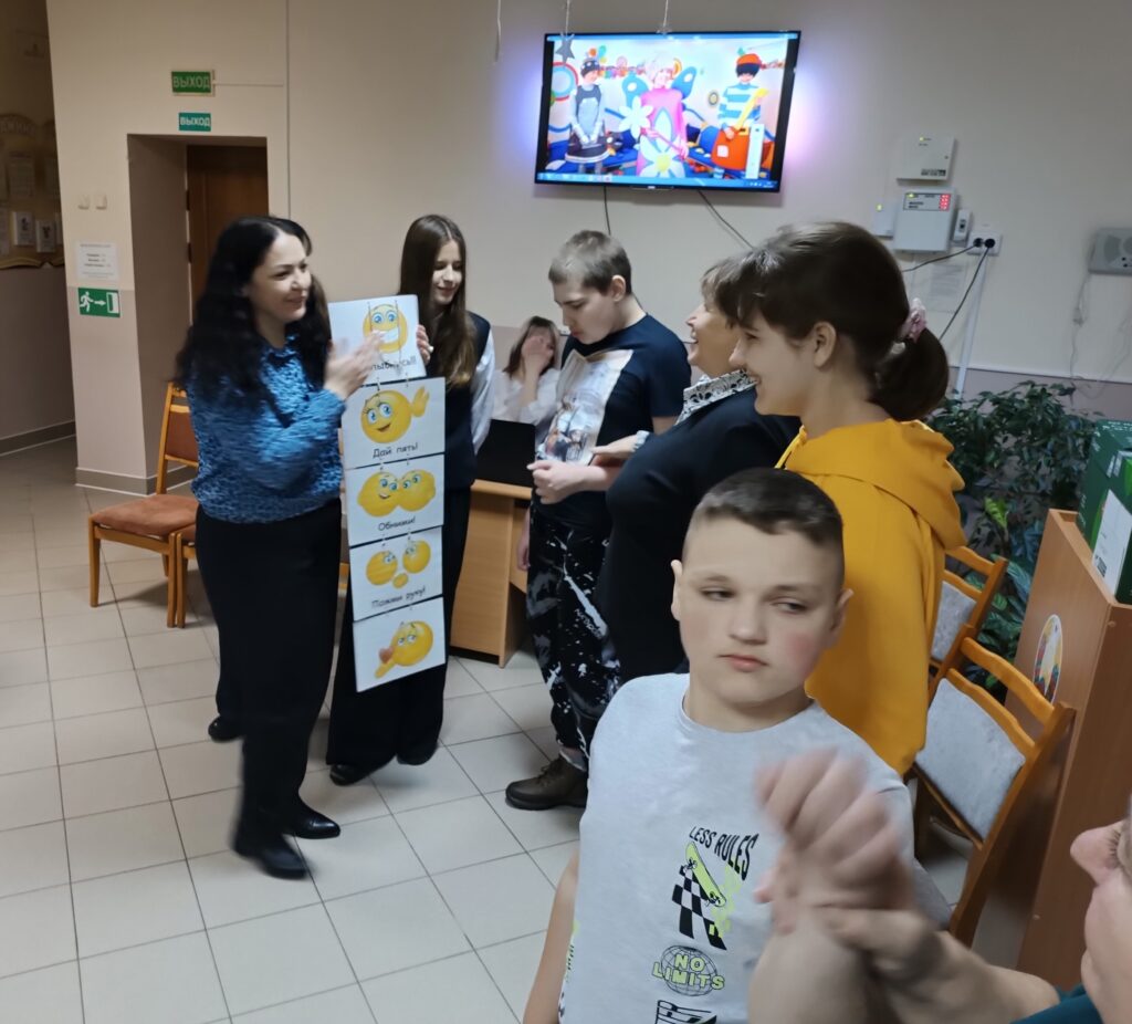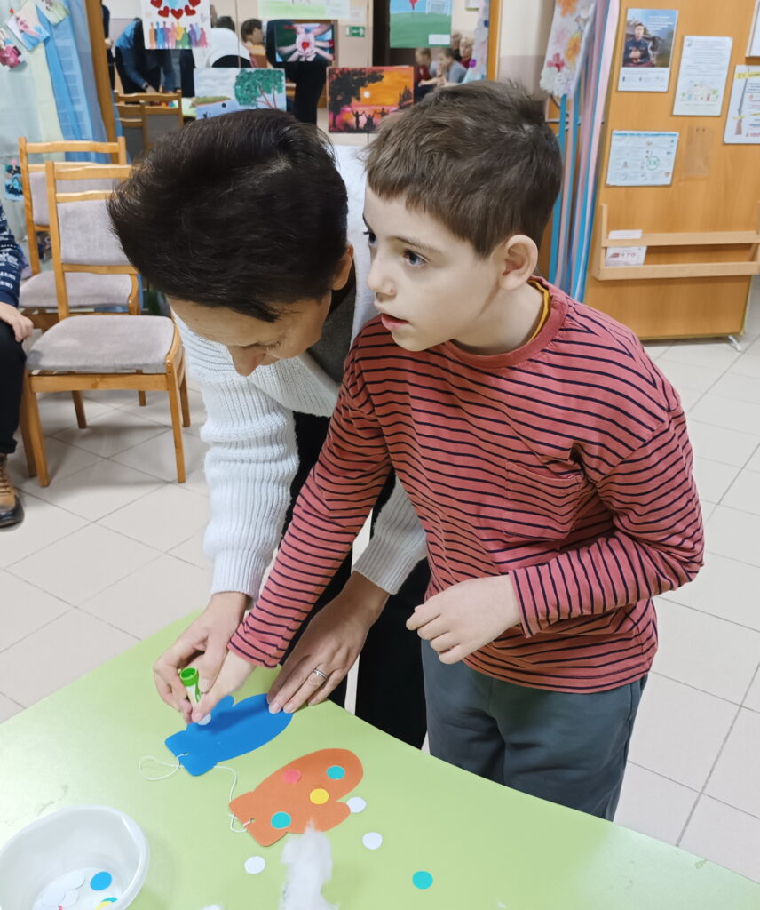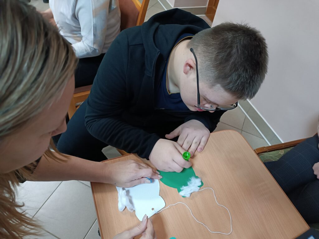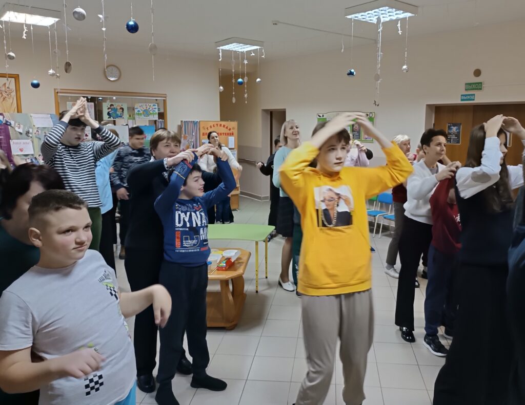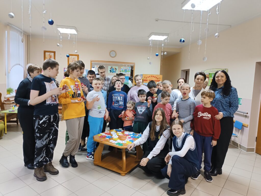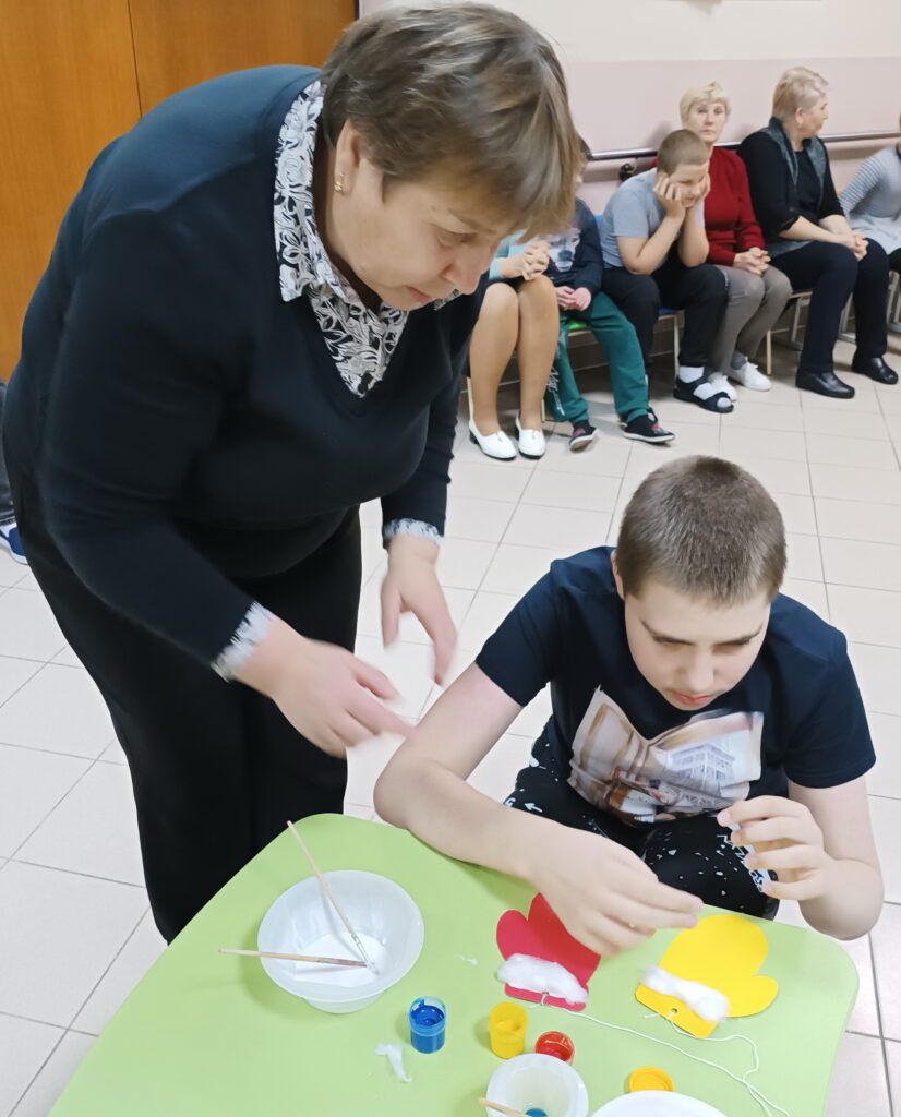 Сегодня, 2 декабря, к нашим детям с развлекательной программой пришли волонтеры ГУО «Средняя школа №3 г.Ошмяны». Вначале веселые ведущие предложили ребятам варианты приветствия – улыбки, объятия, пожатие рук, воздушный поцелуй. Дети с удовольствием приветствовали друг друга, танцевали зажигательные танцы, делали аппликации – украшали рукавички. В завершение праздника гости угощали детей конфетами и мандаринами.